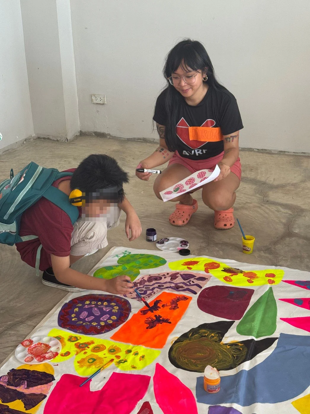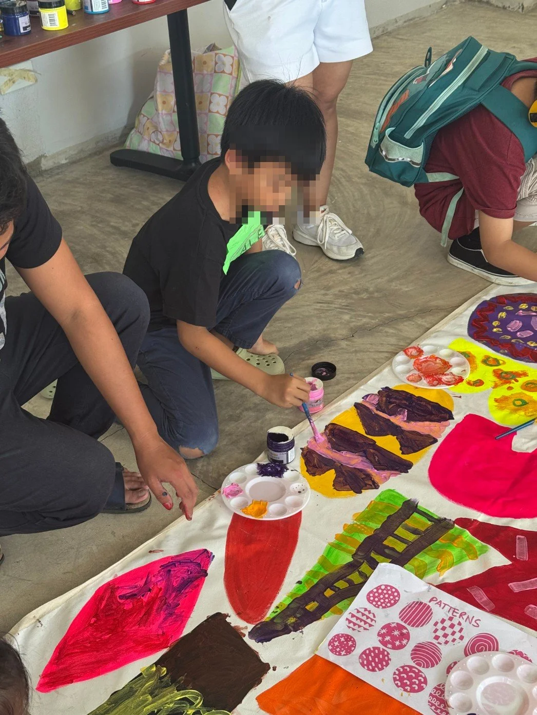 An inclusive group of 15 children (ages 6–12)—both neurodivergent and neurotypical—explored mark-making, pattern building, and collaborative painting in a calm, supportive setting. Families reported strong engagement and confidence gains, and participants completed a shared large-scale artwork.